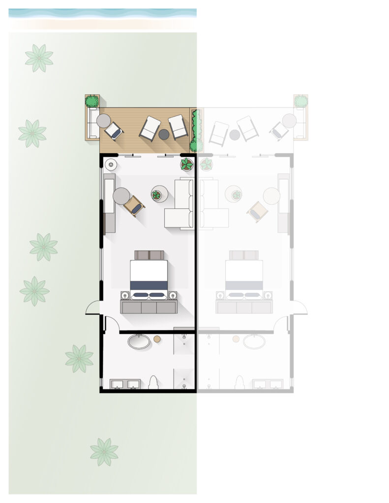 Our Oceanfront King are duplexes with optimal privacy, including patios with views of the Bight of Eleuthera and oversized bathrooms with indoor and outdoor showers and deep soaking tubs.